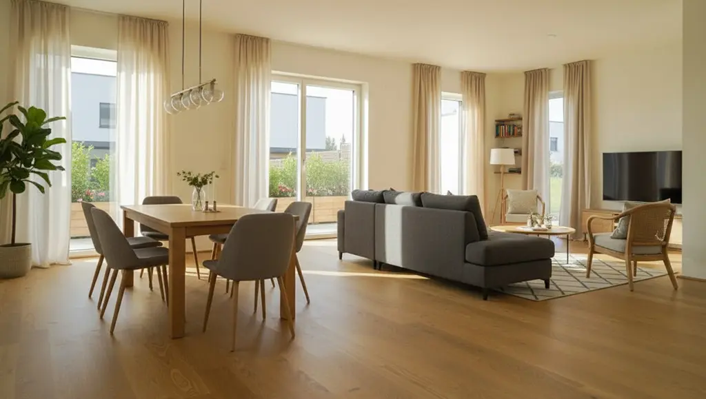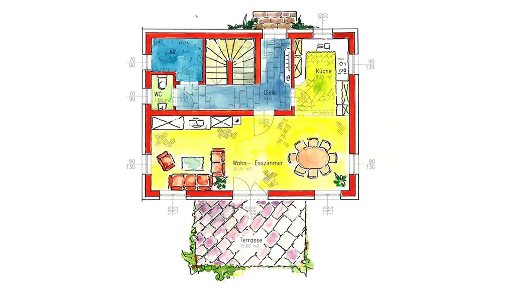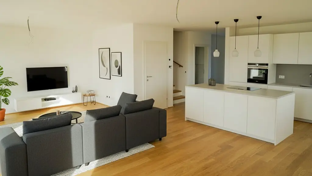Die durchdachte Raumaufteilung umfasst 4 Zimmer, ein Badezimmer mit Badewanne, Dusche und Gäste-WC. Der lichtdurchflutete Wohnbereich mit offener Küche ist das Herzstück des Hauses und lädt zu entspannten Stunden mit Familie und Freunden ein. Eine 20 m² Terrasse ermöglicht es, sonnige Tage und den Blick auf die idyllische Umgebung zu genießen.